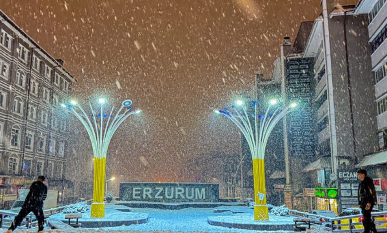 Erzurum’da etkili olan yoğun kar yağışıyla kent merkezi ve tarihi yapılar yeniden beyaza büründü